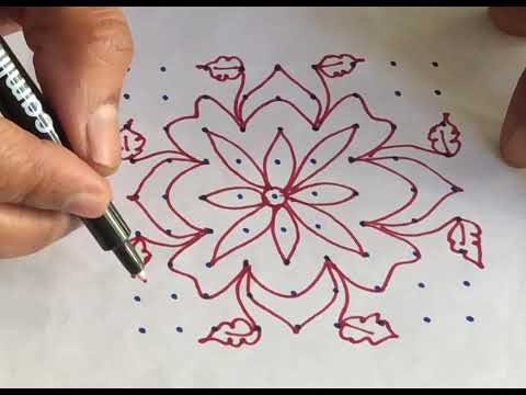 Complete the design by adding small inner details like dots and lines inside the petals and leaves. You can also use different colors to highlight the flower and leaves, making the rangoli more attractive and vibrant.